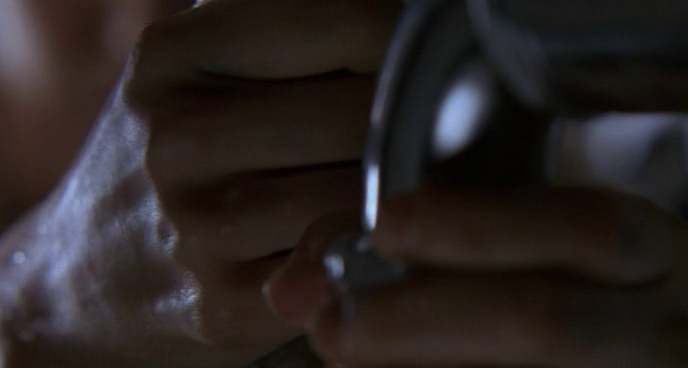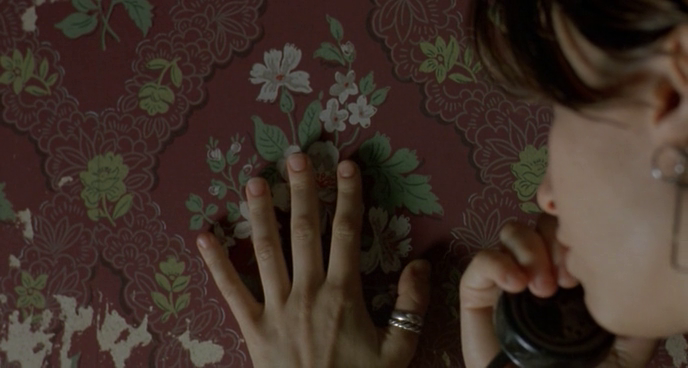 Sex positive feminist Susie Bright worked on Bound as a consultant during the sex scenes, and in her analysis of the film she’d say that Bound scenes of sexuality are coded as being “wet”, and she praised the film for showcasing aspects of lesbian sexuality on film without oversexualizing the characters. There is one scene in particular that in my mind calls up the idea of the film being “wet” and it happens right before Corky and Violet have sex for the first time so I think she’s onto something. The point of view of this scene is with Corky and while she is working to retrieve a piece of jewelry for Violet we get a feeling for her attraction for Violet in numerous ways. The camera focuses on Violet’s legs for a moment, then shows Corky’s hands around a pipe with water leaking out, she’d twist until the pipe loosened and she’d retrieve the jewelry for Violet. When Corky is framed again Violet is standing right next to her and the scene feels steamy because I think the Wachowski’s did a good job of visually representing her thought process in the imagery of this scene.