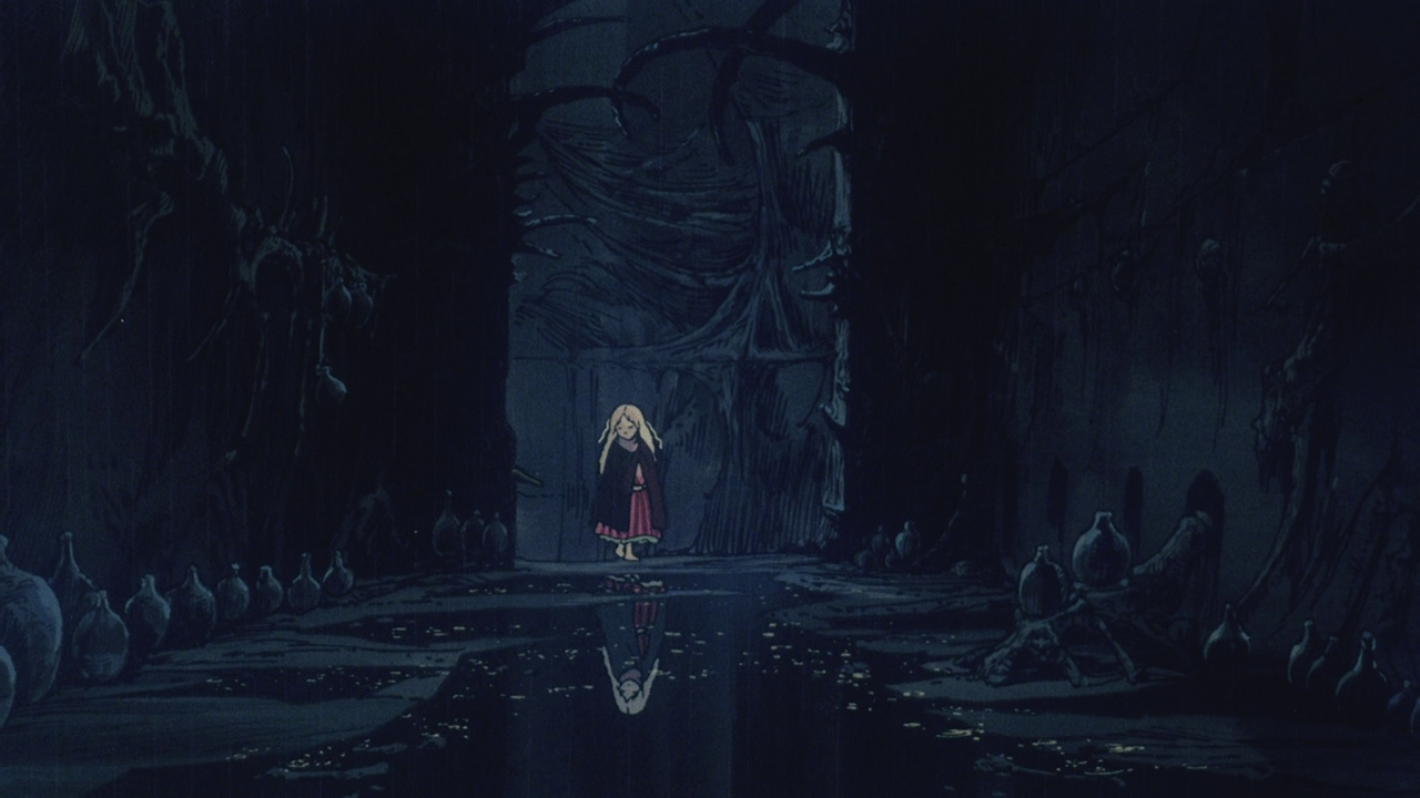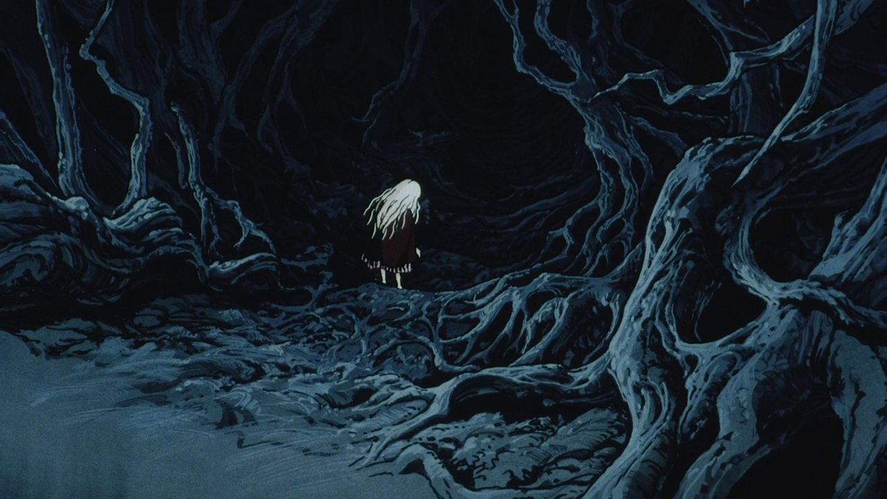 Mamoru Oshii’s Angel’s Egg is coloured by tragedy, and exists as a post World War II picture in the lens of Japan. The setting is never explicitly named, but something has been taken from wherever this ragged fairy tale is set. Elaborately painted backgrounds convey a world on the edge of total destruction. All that is left are fragments of nature and ghosts of buildings that once stood tall. Cracked ceramics and broken childhood toys are furniture. This sense of loss is so exquisitely manufactured through landscape imagery that as purely a reaction to the devastation caused by the atomic bombs this would be an undeniable example of anti-war cinema, but there is more present here than that. A maternal cinema that captures a primal need within some to give birth, in this case metaphorically, to a new world.