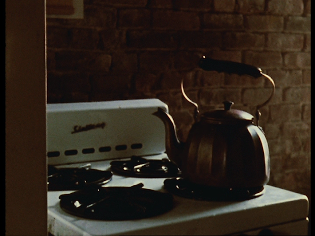 Unlike her first film, Saute Ma Ville, there isn’t a narrative in La Chambre, and Akerman has begun to twist away from conventional cinematic goals into something both entirely her own, and daringly experimental. In La Chambre, Akerman asks many questions and none of them have explicit answers, but the function of the movie is to get the viewer to think of how they view cinema as a narrative art-form and how we latch onto any tidbits of information that may move a story forward. Akerman has consistently been concerned with stillness in her movies, and how that plays into realism (look at the opening third of Je, Tu, Ill, Elle for example), and La Chambre‘s only progression is how this singular woman moves, otherwise objects are at rest. But Akerman is just as interested in those resting objects, and her camera makes a point to frame household items such as chairs, an oven, and a dishwasher with the same priority she frames herself. The framing is meticulous, but never boring, and the images never dull due to the function of the camera’s constant movement. By placing the camera in a 360 degree pan she’s asking audience members to observe how the objects change, even if they don’t. The only changes to the objects are in the lighting, and it’s only slight, but this is something we must view, because the camera demands their importance with the same centered framing as the subject (the woman). Something interesting happens after the first couple courses around the room though- the camera reverses course as if on audience instinct to move towards the woman. The curious thing about this is why that was needed and what Akerman is saying about narrative subjects. She’s just as calm as the chair we’ve already seen twice. Her movement isn’t any more fascinating than how the light reflects off of a wall, but the camera is pulled to her, because she moves. Each repetitive movement of the camera becomes tighter and tighter until the camera keeps the woman in frame for the better part of a minute, but she remains listless as she devours an apple. When the camera finally realizes there is nothing to see here the lens pulls away from her again and the movie ends. What was the subject? Is a subject even needed to produce cinema? These questions aren’t definitely answered, but explored and beg to be analyzed by viewers.