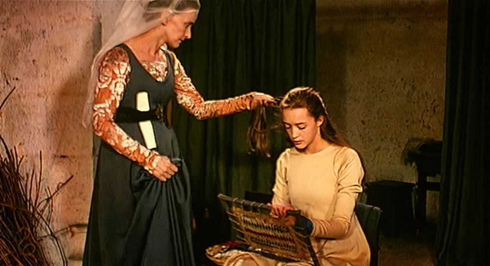 Joan giddily darts a pair of scissors across her unkempt straw-like hair in order to please god and herself. She chooses a mirror of armour, a masculinizing of vanity. Her reflection reveals an evolving self. In order for Joan to go into battle she must adopt the roles of men. If she is going to be with the men she must be a man. Her first task is to remove the long hair that paints her as feminine. She mutters to another woman who works nearby that she must look like a boy, and in an attempt to make her haircut more appropriate the woman offers to even up her look. This early scene paints a portrait that continues throughout the rest of the film, and it is one of women helping Joan achieve her goals. Whether those women know that Joan is only merely doing these things because she sees messengers of god or they envision a woman breaking barriers of gendered norms is irrelevant. They help her regardless. The same woman who cuts her hair finds her a suit of armour made from hand-me-downs of smaller boys.