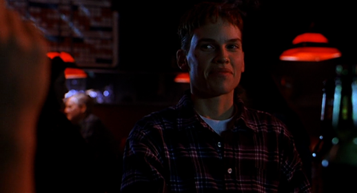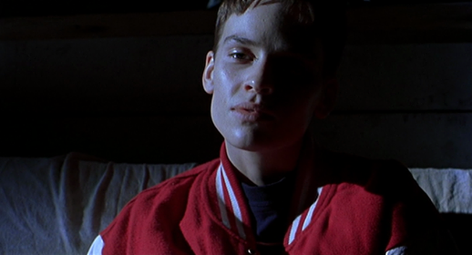 CG: The shot of Swank’s was what I meant about the saddest looking boxer briefs in cinema. It is so baggy. I went through a massive weight loss and my boxer briefs never looked that baggy. But it is there in the film and it looks ridiculous. You are right about the horror of mirrors. You feel at odds with what you have outside versus how you feel on the inside. Brandon gets a haircut at the beginning and apparently that is all it took for him to step out and present. As somebody who had his hair long for an extended period of time even after I started transitioning, haircuts are crucial but there were ways that I passed in spaces with longer hair. The real Brandon Teena photos are interesting to look at as he has a bit of a bouffant and a baby mullet- versus Swank’s more traditionally masculine crew-cut- that for the time period seem like either gender could have pulled that off. But it is about confidence above all else and it takes a lot of it to do what Brandon does.