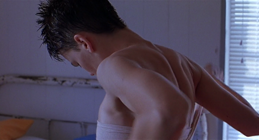 I’m going to talk about dysphoria for a moment and the film’s odd relationship with mirrors. The most obvious of these is the scene you mentioned briefly earlier where Brandon tapes his breasts and gets dressed for the day. This is shot in a way where audiences can interpret Swank’s body (which is something I’ll get to a minute), and there are these gentle reminders of how this body is made. I’ve said previously in this series that Transgender Cinema has to be a cinema of bodies, but this isn’t what I’m talking about. This is cis gaze, and a total misunderstanding of transgender bodies and how we navigate being inside our own skin pre-transition. The most damning image of these is the close-up on Swank’s crotch. It’s only there to show how flat her genitalia is in underwear. There is no penis. The image lingers, but we fucking don’t do this sort of thing. During Pre-transition mirrors are like this horrific thing. It’s something to flee and yet there’s this moment where Brandon is almost vogeuing and modeling, and I find that really bankrupt. There’s no reconciliation moment where Brandon comes to terms with his body and then checks himself out. No, it’s just this moment of titilation, and I find it really gross. You could perhaps argue the “I’m such a jerk” comment is his reconcilation, with his body, but again, I don’t know what those words mean in the context of this movie. It makes little sense.